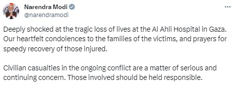 ന്യൂഡല്ഹി: ഗാസയിലെ ആശുപത്രിക്ക് നേരെ ഇസ്റാഈല് ആക്രമണത്തില് 500 ലേറെപ്പേര് കൊല്ലപ്പെട്ട സംഭവത്തില് പ്രതികരണവുമായി പ്രധാനമന്ത്രി നരേന്ദ്രമോദി. ഗാസ അല് അഹ്ലി ആശുപത്രിയില് ദാരുണമായി ആളുകള്ക്ക് ജീവന് നഷ്ടപ്പെട്ട സംഭവം ഞെട്ടലുണ്ടാക്കിയെന്ന് അദ്ദേഹം എക്സില് കുറിച്ചു. സംഘര്ഷത്തില് സാധാരണക്കാര് കൊല്ലപ്പെടുന്നത് വലിയ ആശങ്കയുണ്ടാക്കുന്നുവെന്നും ഇതിനുപിന്നില് പ്രവര്ത്തിച്ചവരെ വെളിച്ചത്തുകൊണ്ടുവരണമെന്നും അദ്ദേഹം ആവശ്യപ്പെട്ടു. ”ഗാസയിലെ അല്അഹ്ലി ആശുപത്രിയിലുണ്ടായ ദാരുണമായ സംഭവത്തില് ഞെട്ടലുണ്ടായി.